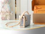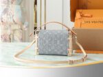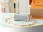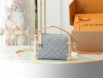 New Gray Denim Soft Box Side Trunk Medium Handbag Inspired by Louis Vuitton’s vintage suitcases, it reinterprets the 2005 Monogram Denim pattern with a unique bleached finish. It is embellished with light gold hardware, including tree trunk-inspired corners, and is trimmed with contrasting leather. The stylish design features the iconic S-shaped lock and is sized to store daily necessities. Dimensions: 23.5 x 16 x 8.5 cm.